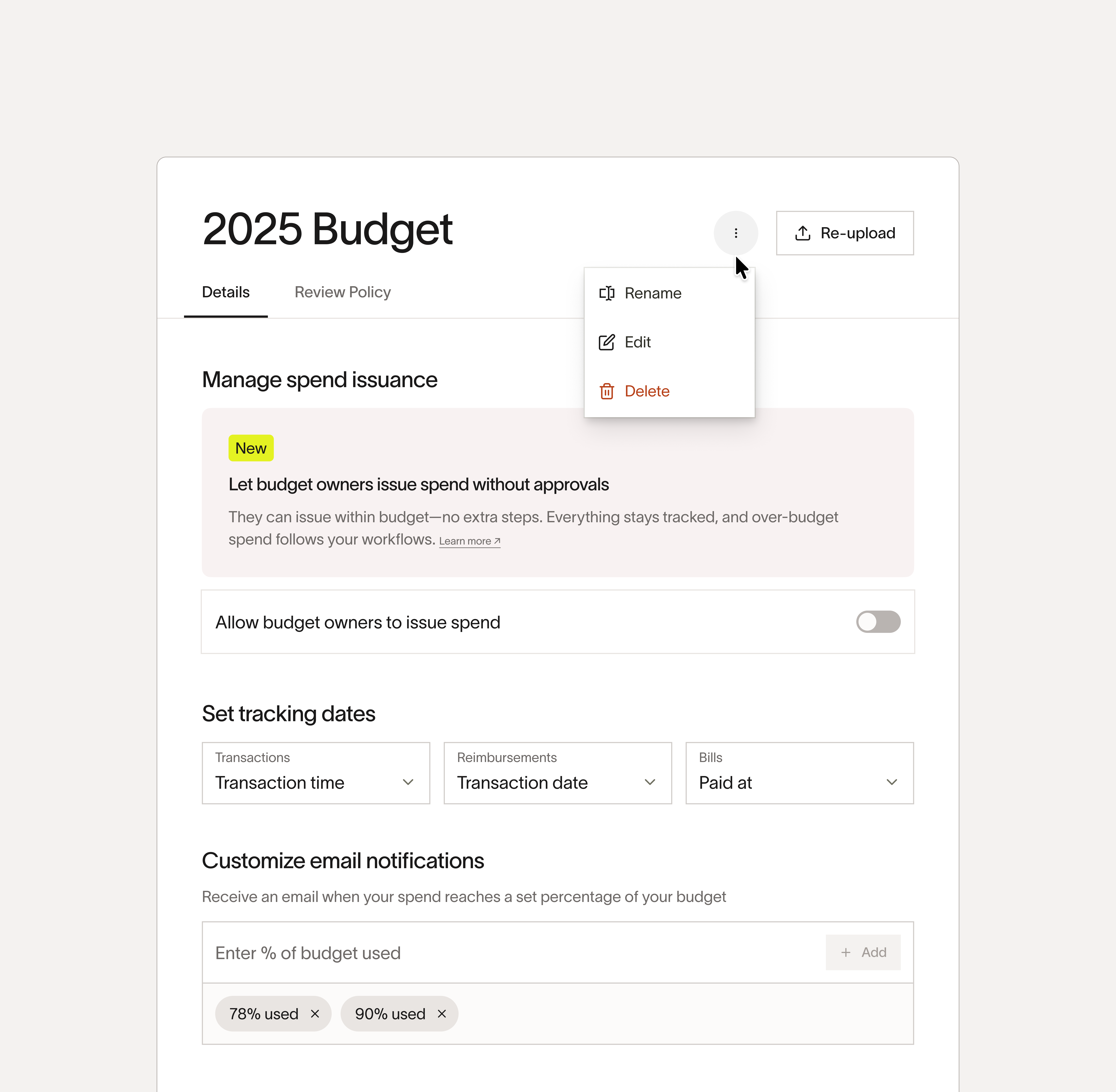 A centralized place for teams to plan and track spending in real time across cards, reimbursements, and bills, giving budget owners clear visibility and accountability.